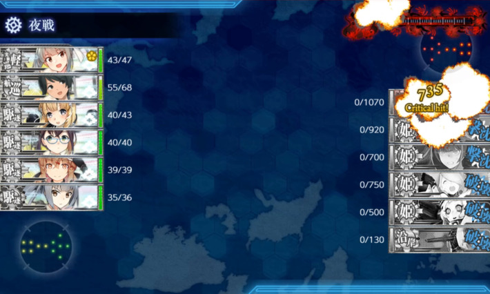 そして画像は2戦目、昼戦終了時の状況。前回とは違い各種攻撃が綺麗に決まり、2択まで追い込むことに成功。後はタシュケント以外はほぼ無傷なフィニッシャー陣(夕張、最上、霞)の一撃に賭けることになります。